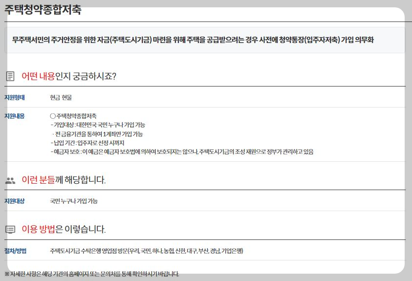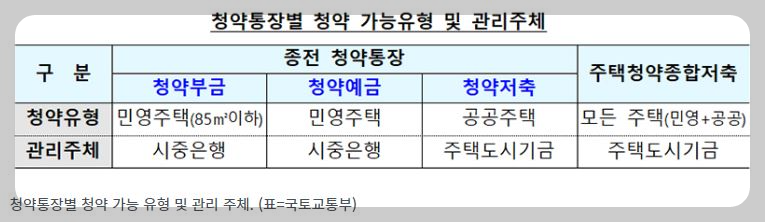 국토부는 청약제도 개선을 통해 통장 유형에 따라 민영/공공주택 하나만 청약이 가능했던 정전의 청약예금/부금, 청약저축통장 등 입주자저축을 모든 주택 유형에 청약할 수 있는 주택 청약종합저축통장으로 전환을 허용하며, 청약통장 월납입금 인정 한도를 10만 원에서 25만 원으로 상향하여 소득공제 혜택을 확대하게 되었다.