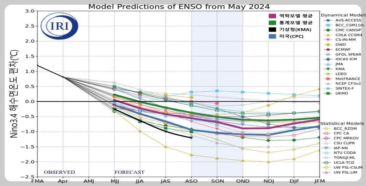 엘리뇨 / 라니냐 감시구역의 해수면온도는 가을철 동안 평년보다 낮을 것으로 전망됩니다. 이로 인해, 점차 라니냐가 발달할 가능성이 있습니다. 라니냐 현상은 전 세계 기후에 영향을 미칠 수 있으므로, 지속적인 모니터링이 필요합니다.