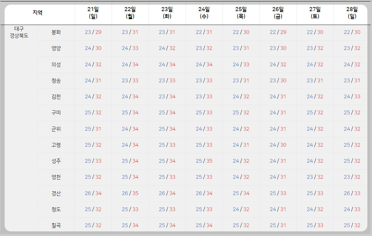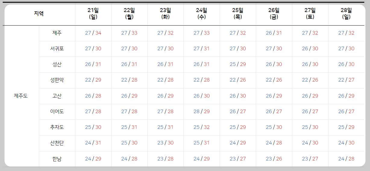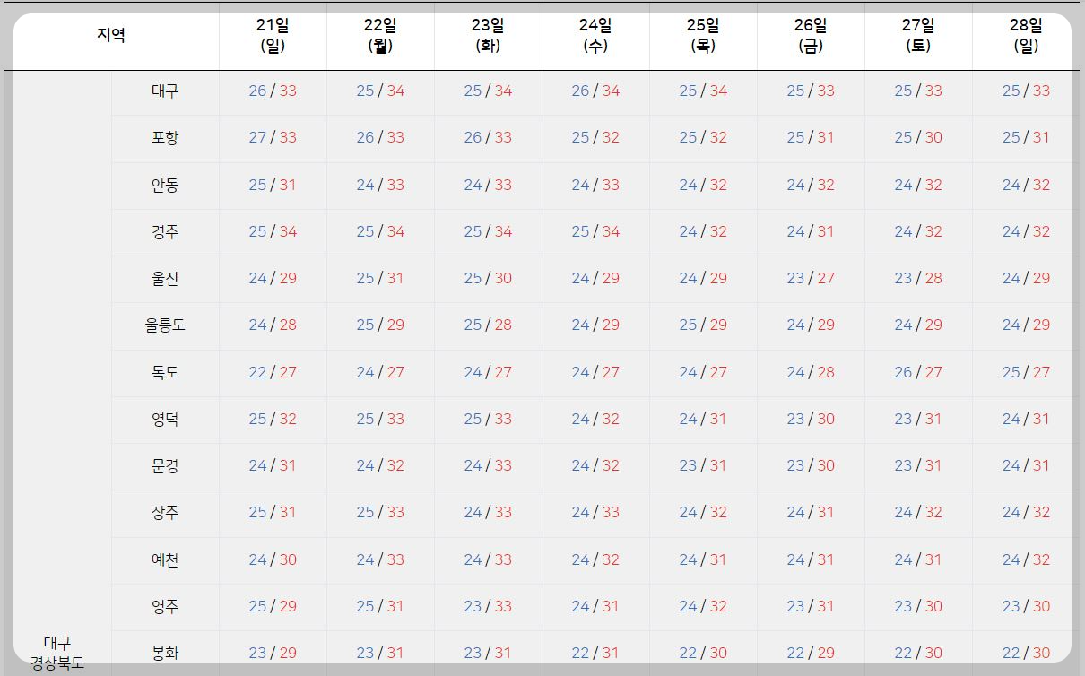 기온 : 아침 23 ~ 27도, 낮 28 ~ 34도 (평년 최저 21 ~ 24도, 최고 28 ~ 33도)