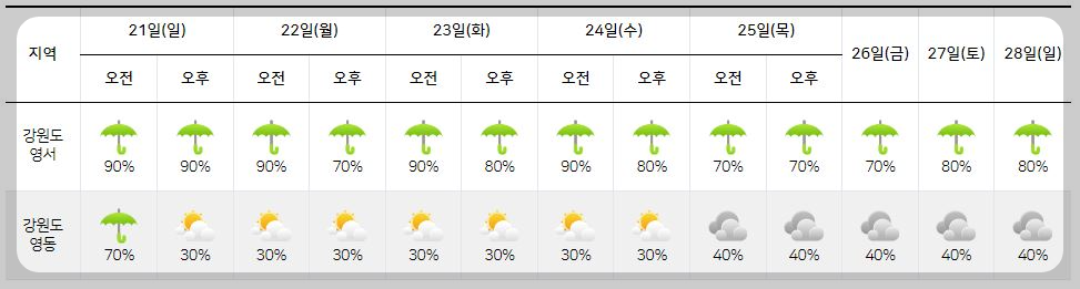 강수 : 7월 21일 일요일 오전 비 내림, 7월 21일 일요일 오후 ~ 7월 28일 강원영서 비 내림
