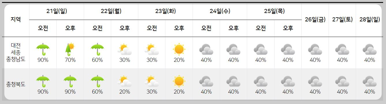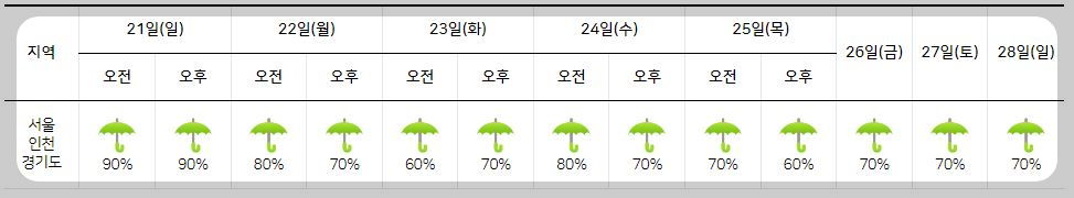 강수 : 7월 21일 일요일 ~ 22일 일요일 오전 비내림