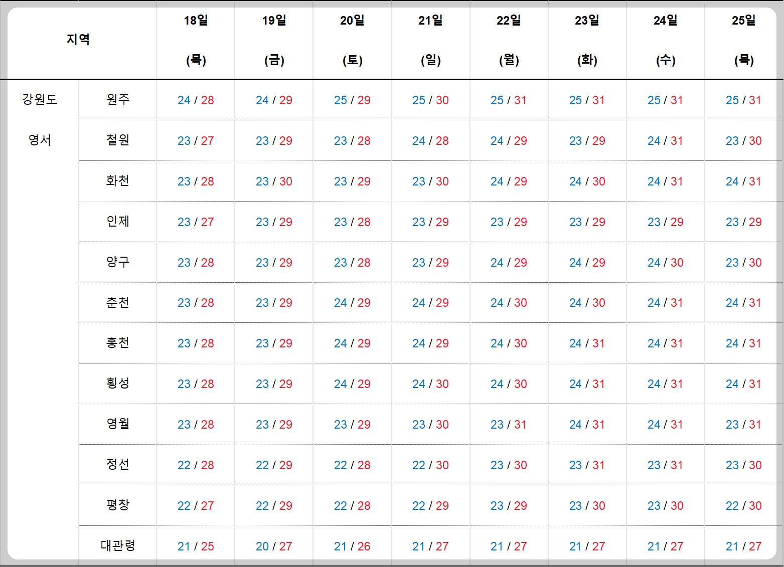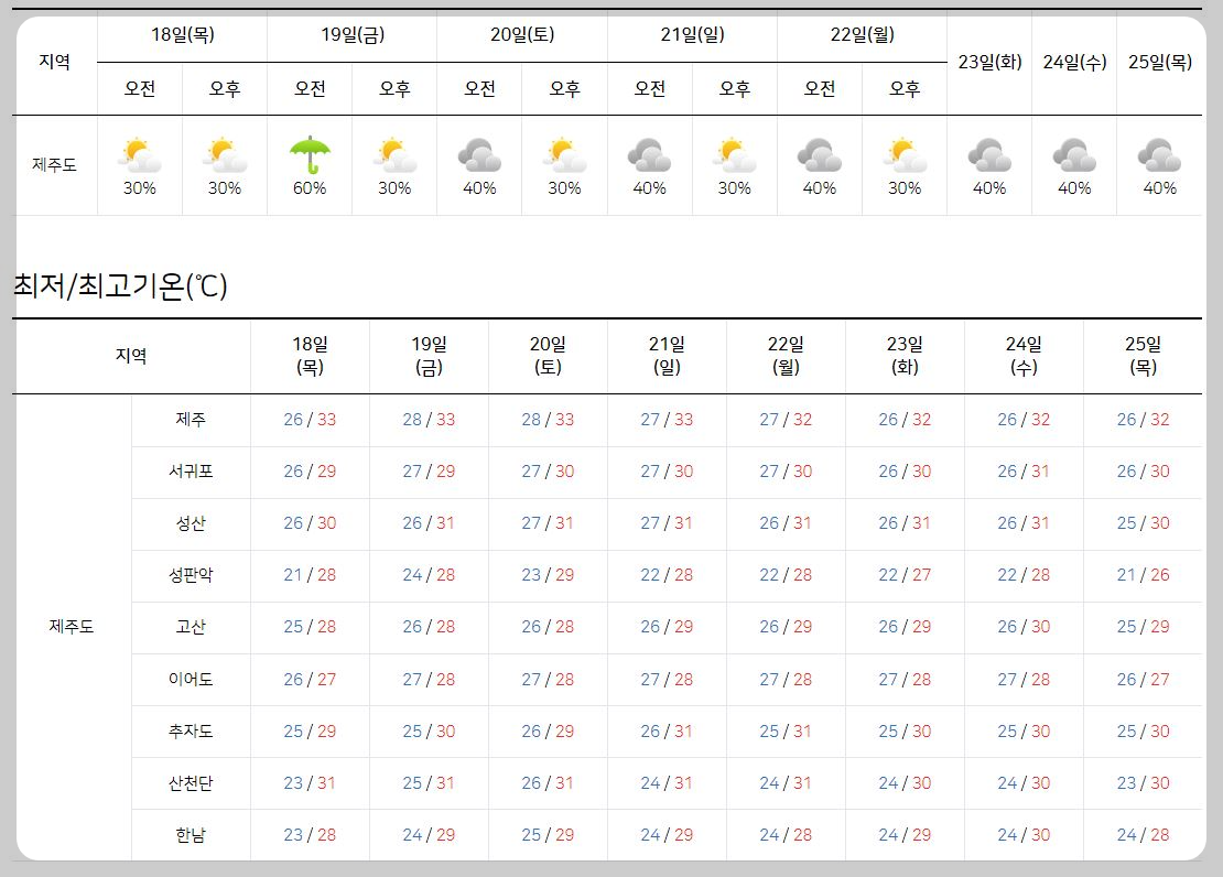 장마는 우리 곁에 계속 지내고 싶은지 오늘도 흐리고 비고, 기상청 날씨 또한 계속 흐리고 비입니다. 그런데 지난주는 일주일 내내 비 예보였는데 막상 해님이 쨍쨍 내리쬐는 날씨도 여러 날 있었습니다. 오늘은 2024년 7월 18일 ~ 25일까지의 전국 주간 주말 제주도 전국 날씨 정보를 기상청 날씨누리 예보를 통해 공유합니다.