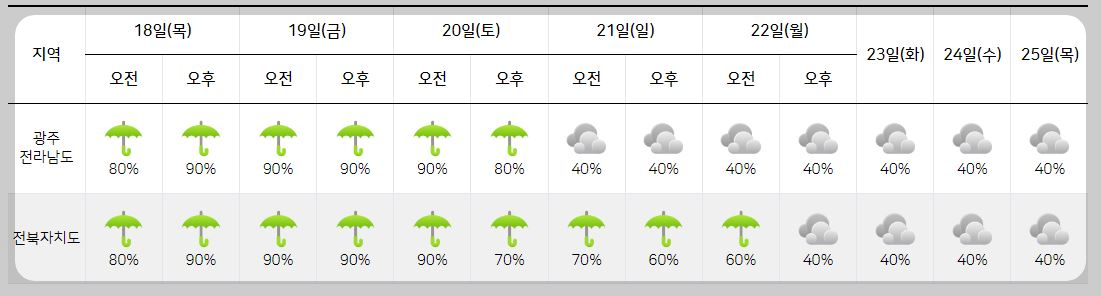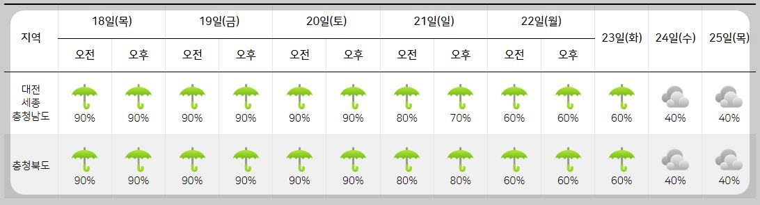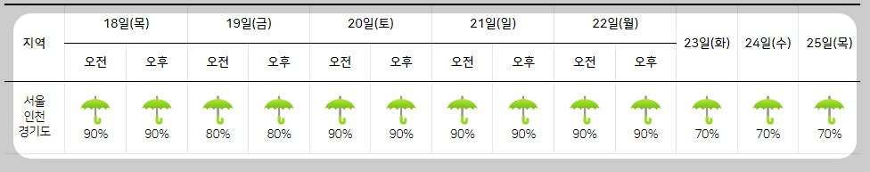 강수 : 2024년 7월 18일 목요일 ~ 7월 22일 월요일까지 오전은 비가 내릴 예정.