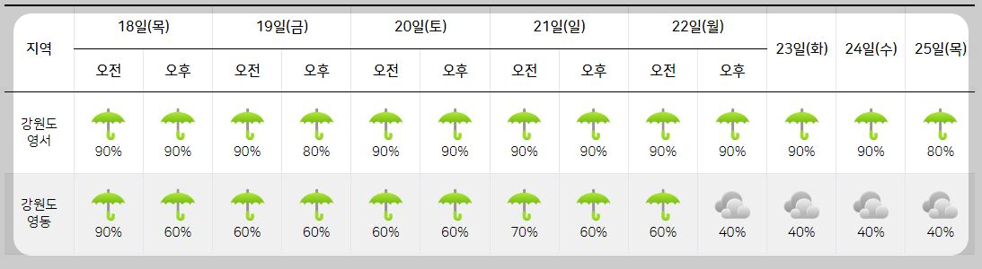 강수 : 2024년 7월 22일 월요일 ~ 7월 25일 목요일까지 비가 내릴 예정 (강원영동 제외).