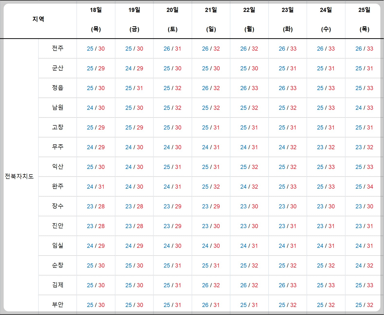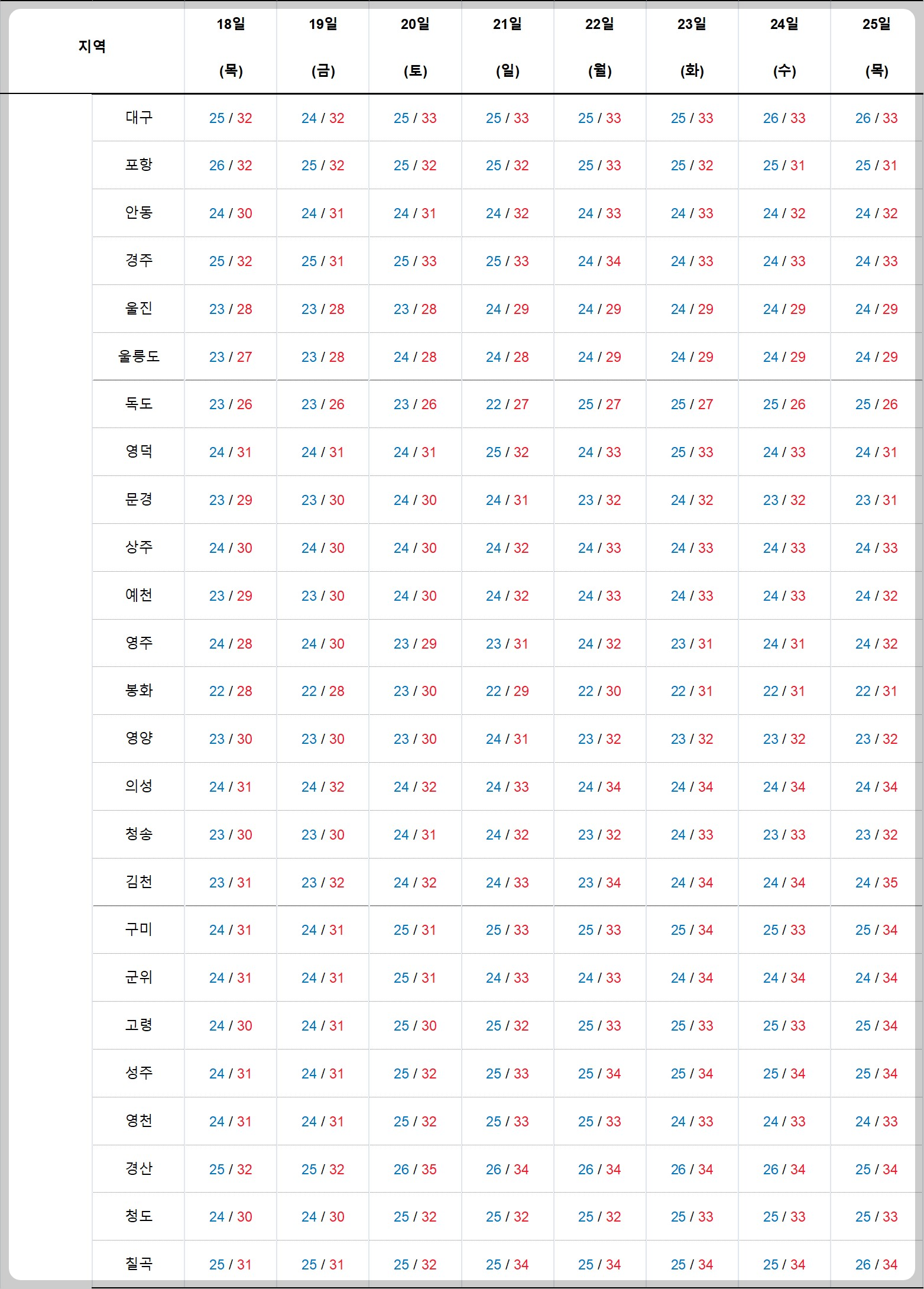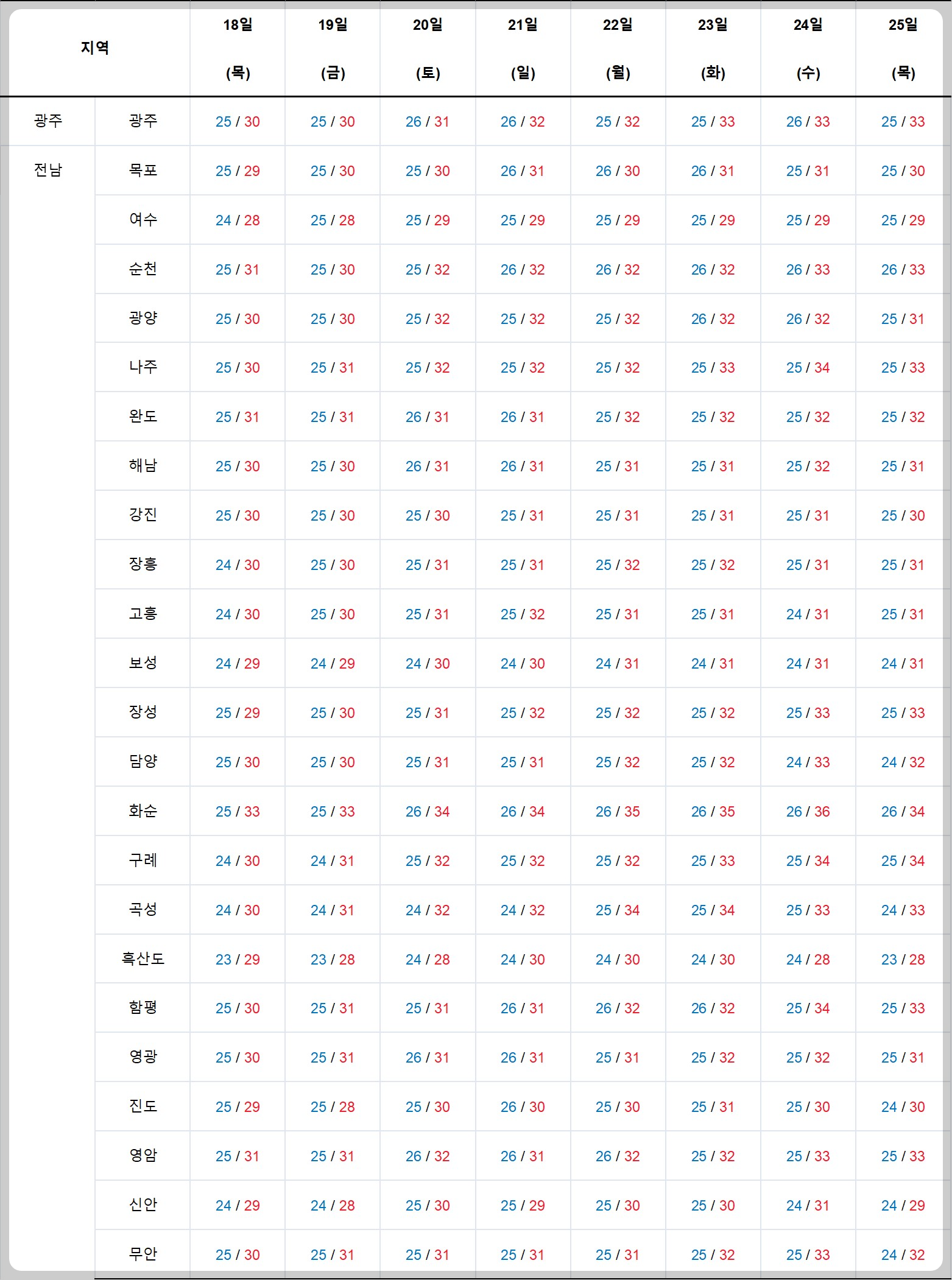 기온 : 아침 20 ~ 25도로 평년 (21 ~ 23도) 보다 조금 높고, 낮 기온 27 ~ 32도로 평년 (28 ~ 31도)과 비슷.