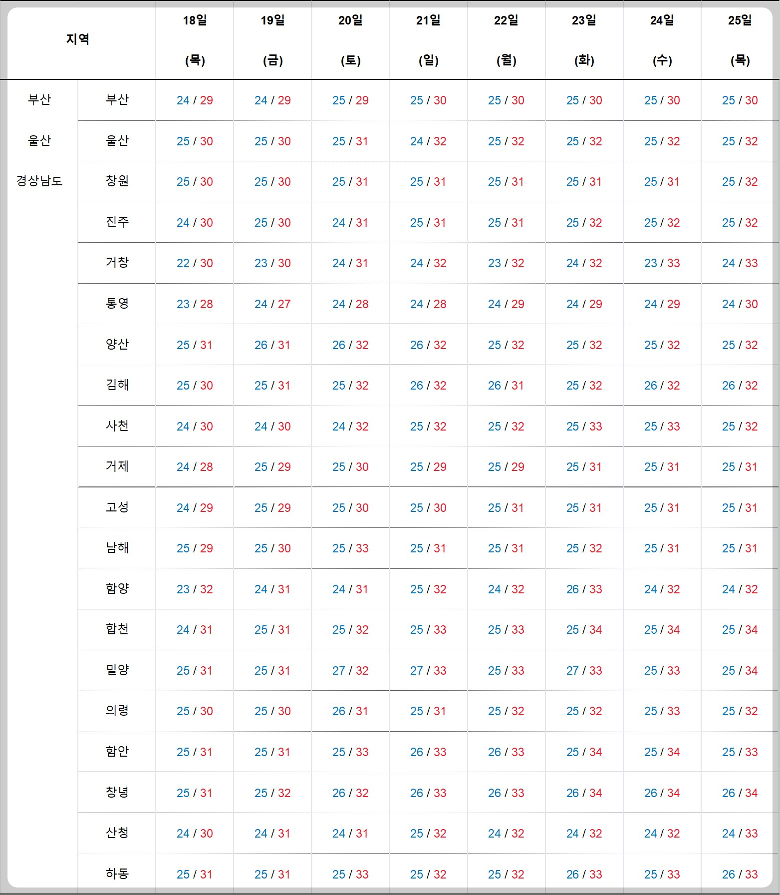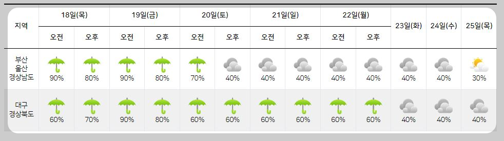 강수 : 2024년 7월 18일 ~ 7월 20일까지 부산, 울산, 경남권 오전에 비가 내릴 예정.