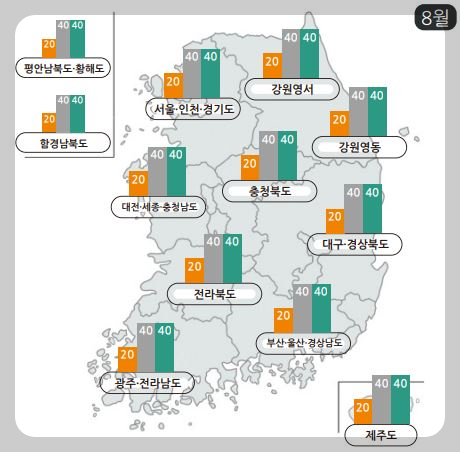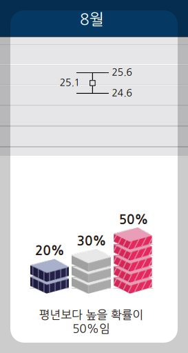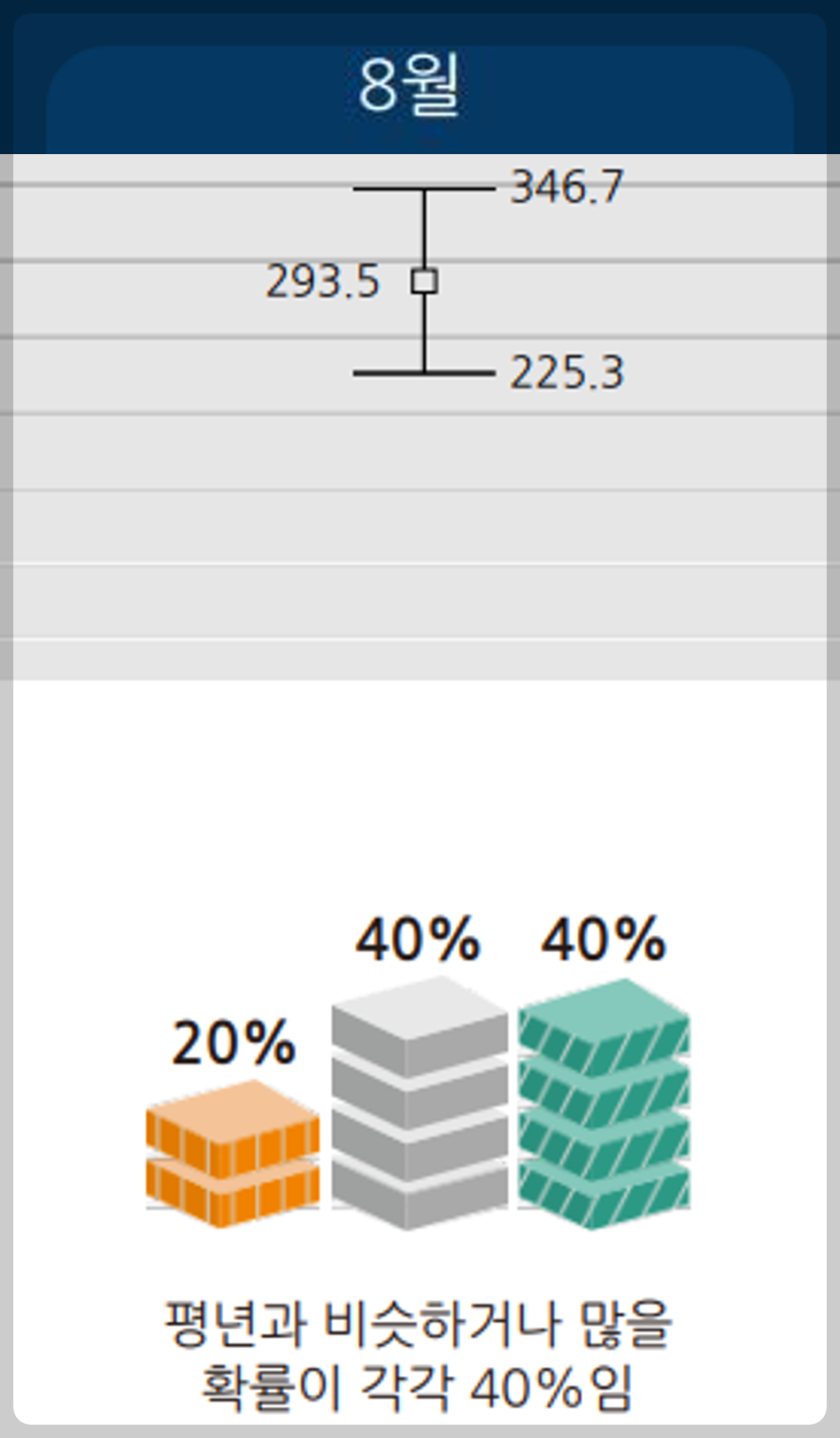 8월은 평년과 비슷하거나 많을 확률이 40%입니다. 2024년도 8월 즉 여름에 비가 많이 내릴 것이라고 하던데 조금은 지켜봐야 할 것 같습니다. 그래도 우산과 여름 대비 차량 점검은 미리미리해 두시기 바랍니다.