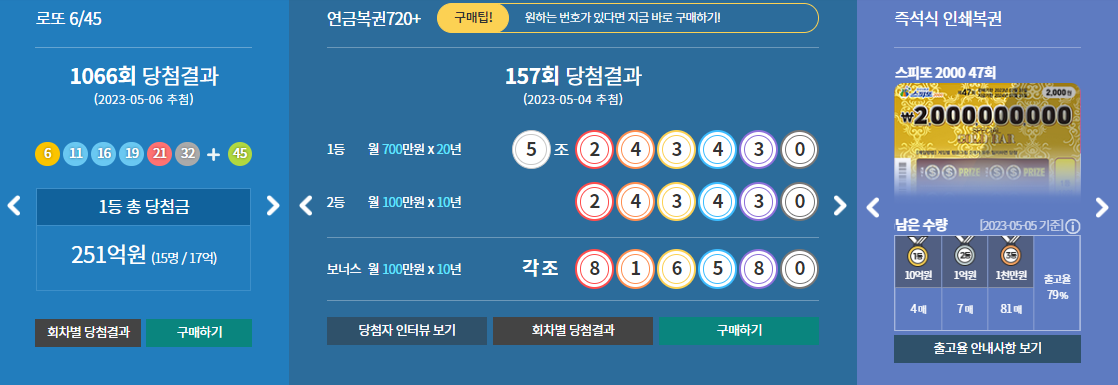5월 6일 로또 1066회 당첨결과, 5월 4일 연금복권 157회 당첨결과, 즉석식 인쇄복권 스피또 2000 47회 남은 수량 및 출고율 안내사항에 대한 정보를 공유합니다. 힘을 내서 소중하게 사고, 돈 사용 잘하시고 부자 됩시다.