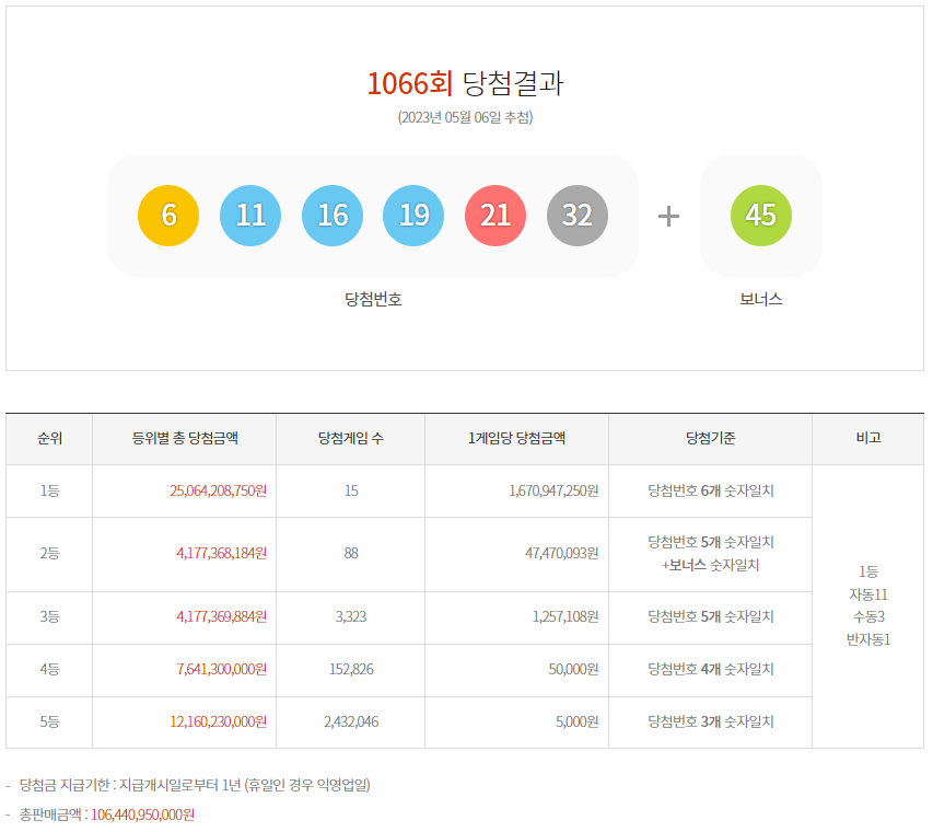 로또 6/45 1066회 당첨결과 (상세 확인은 여기로)