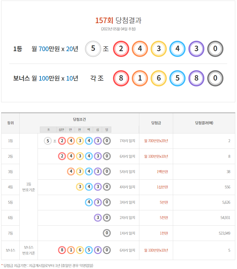 연금복권 720+ 157회 당첨결과 (상세확인은 여기로)